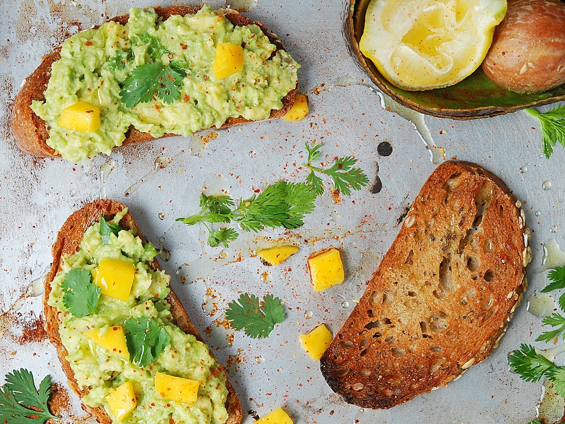 Pour finir, étalez la purée d’avocat sur le pain grillé, ajoutez quelques dés de mangues et les feuilles de coriandre restantes. Ajoutez une autre pincée de piment et un filet d’huile d’olive.